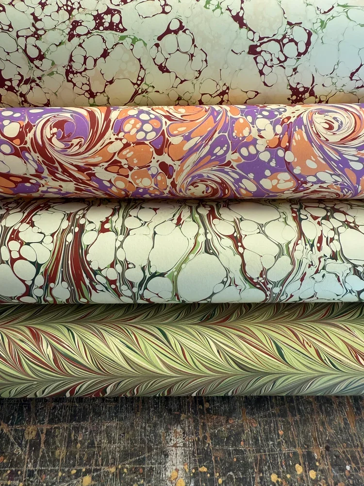 The papers I use come from talented makers and designers all over the world. I collect washi papers from Japan, ranging from delicate florals to bold geometrics. In London, I look for hand-printed decorative papers — subtle stripes, vintage-inspired florals, and timeless damask patterns. Italian papers often feature rich textures, classic motifs, and vibrant colors, while Parisian papers include whimsical illustrations and intricate designs that feel elegant yet playful.