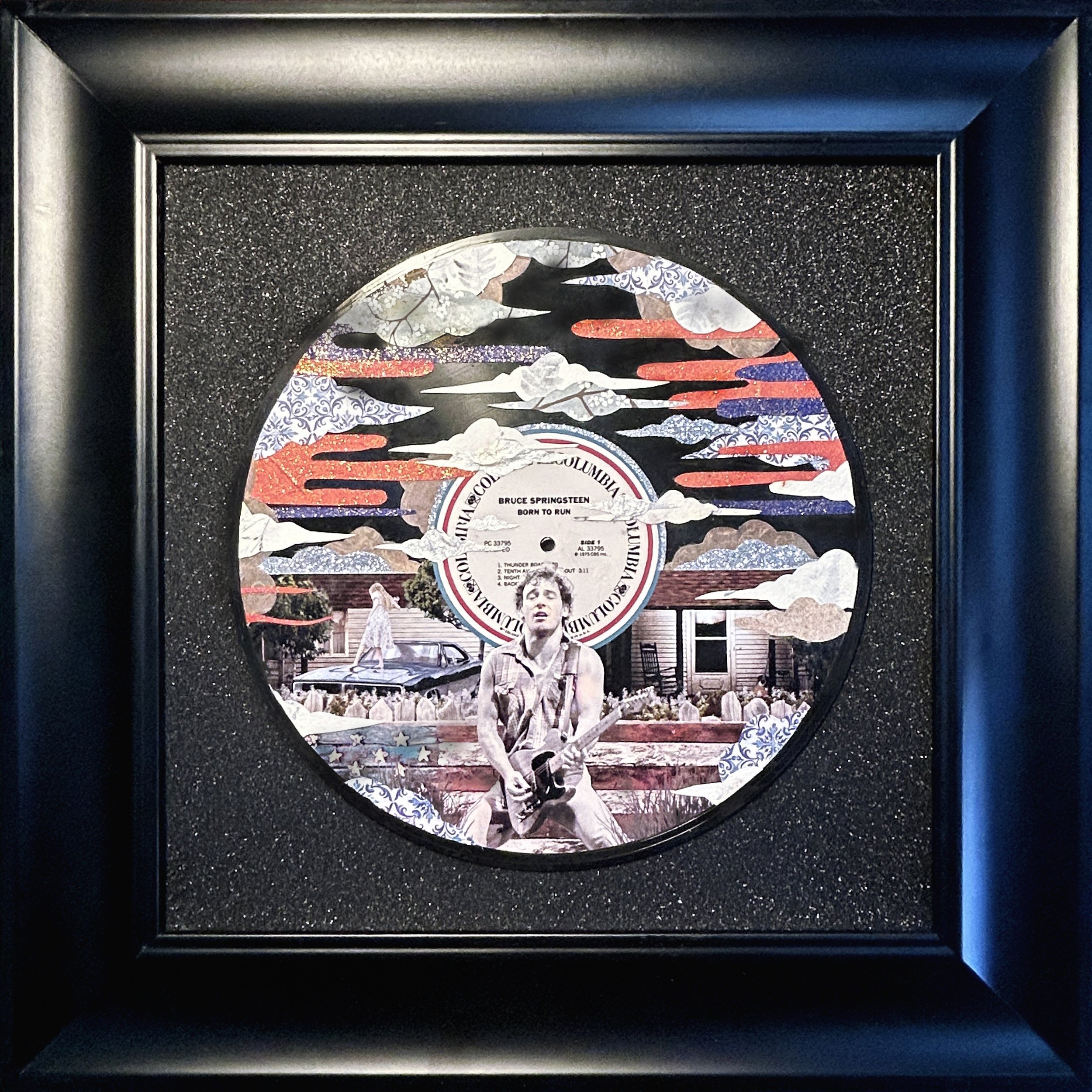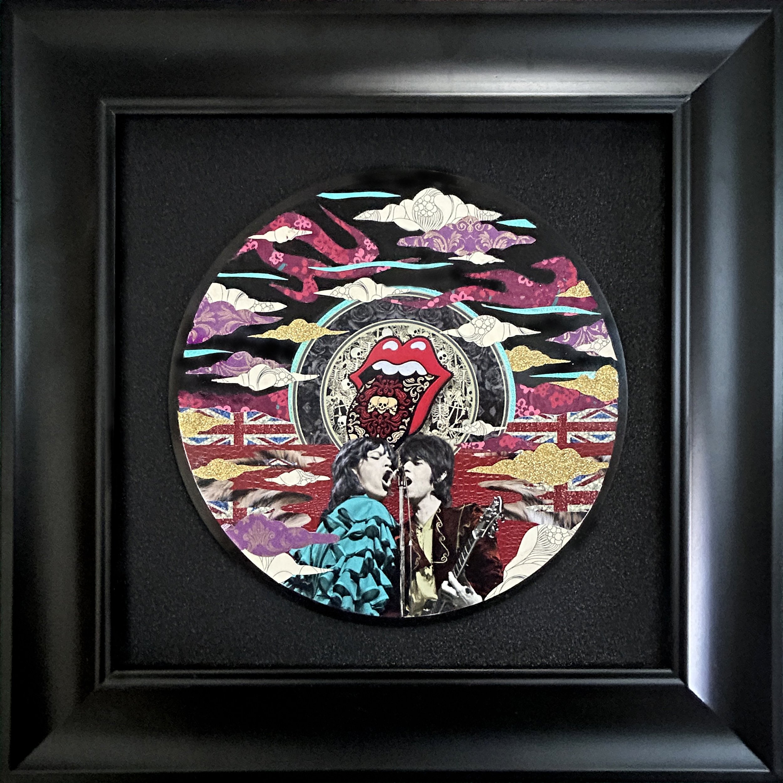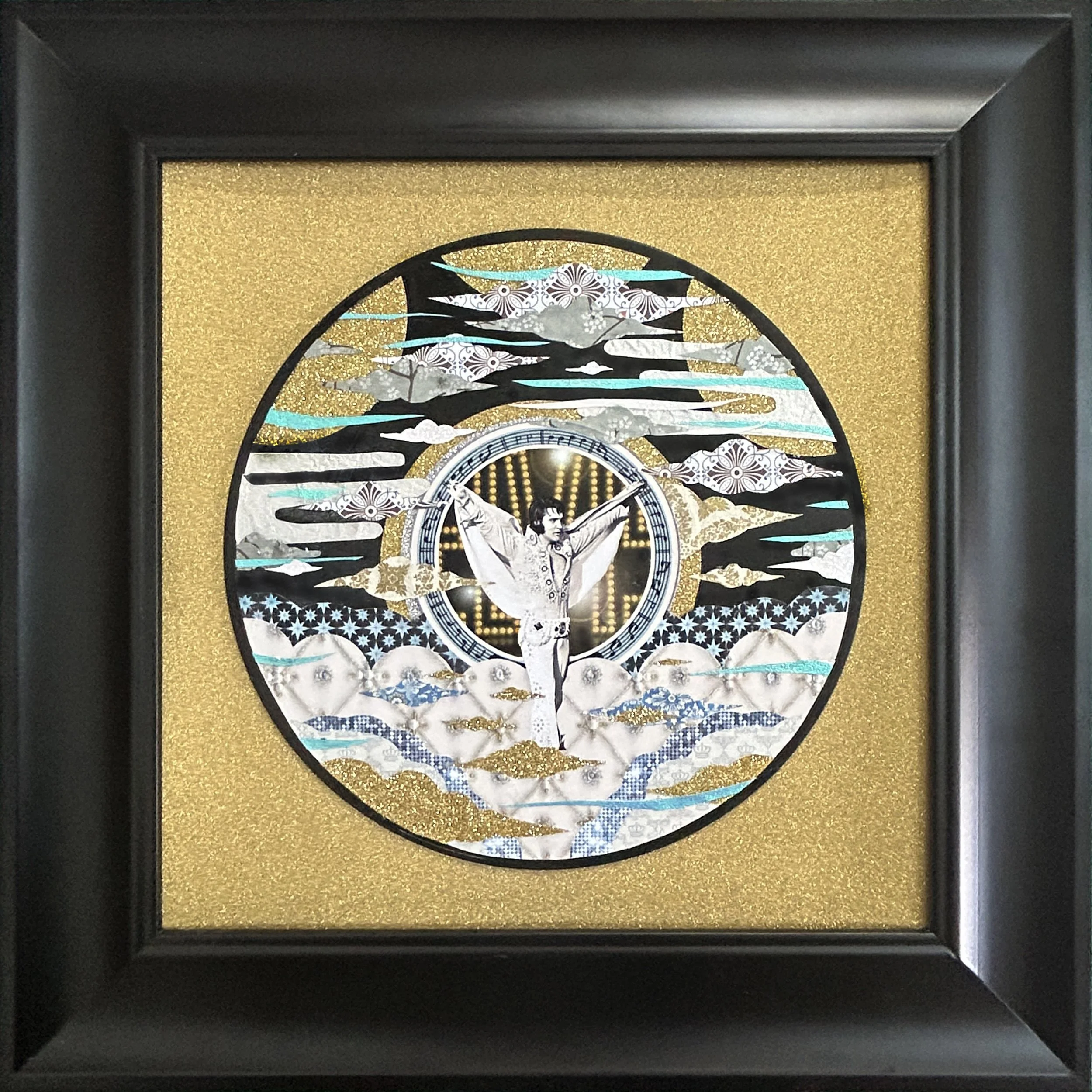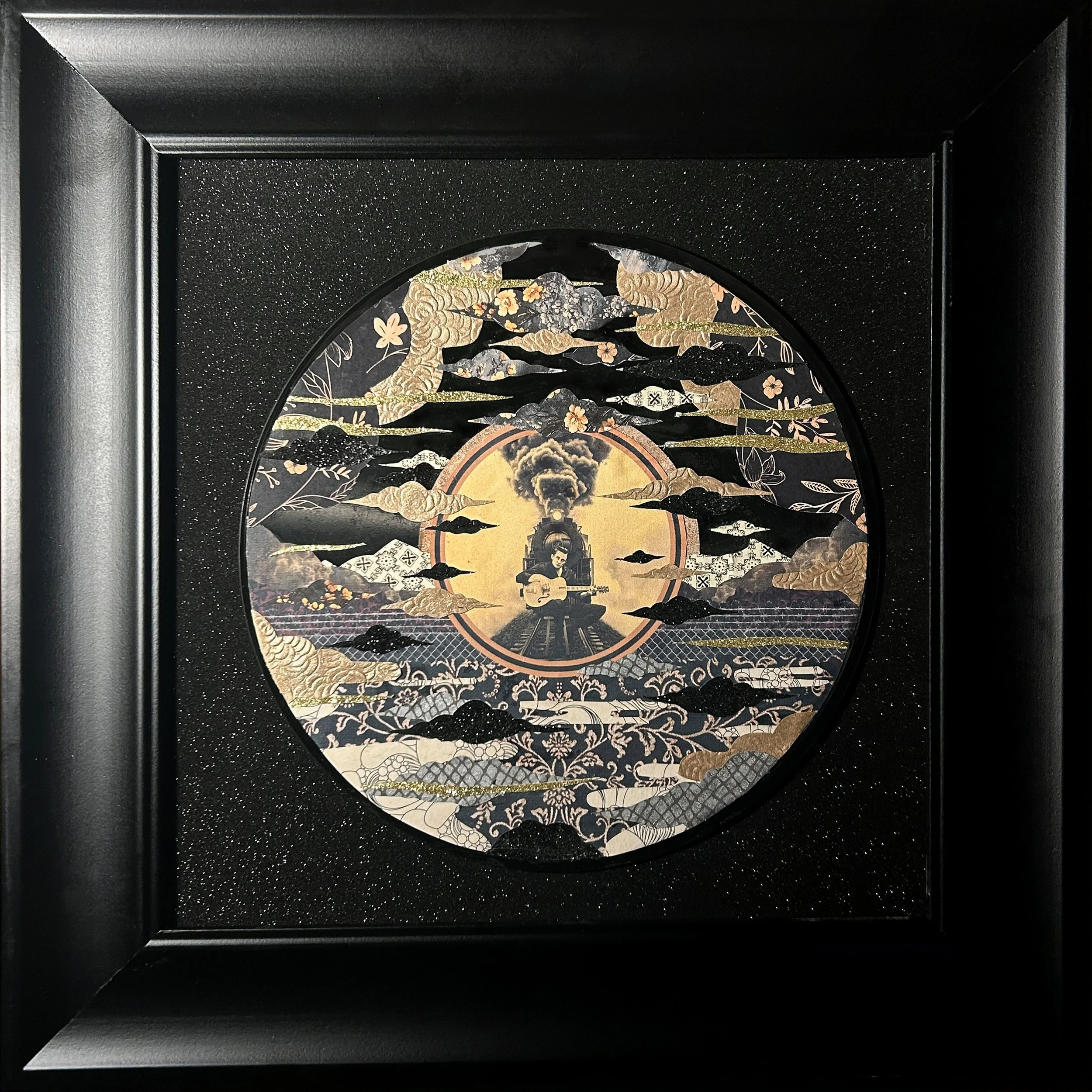 Set upon authentic vintage vinyl records, this mixed-media collage seamlessly integrates digital and analog processes, layering iconic rock imagery with finely curated decorative papers