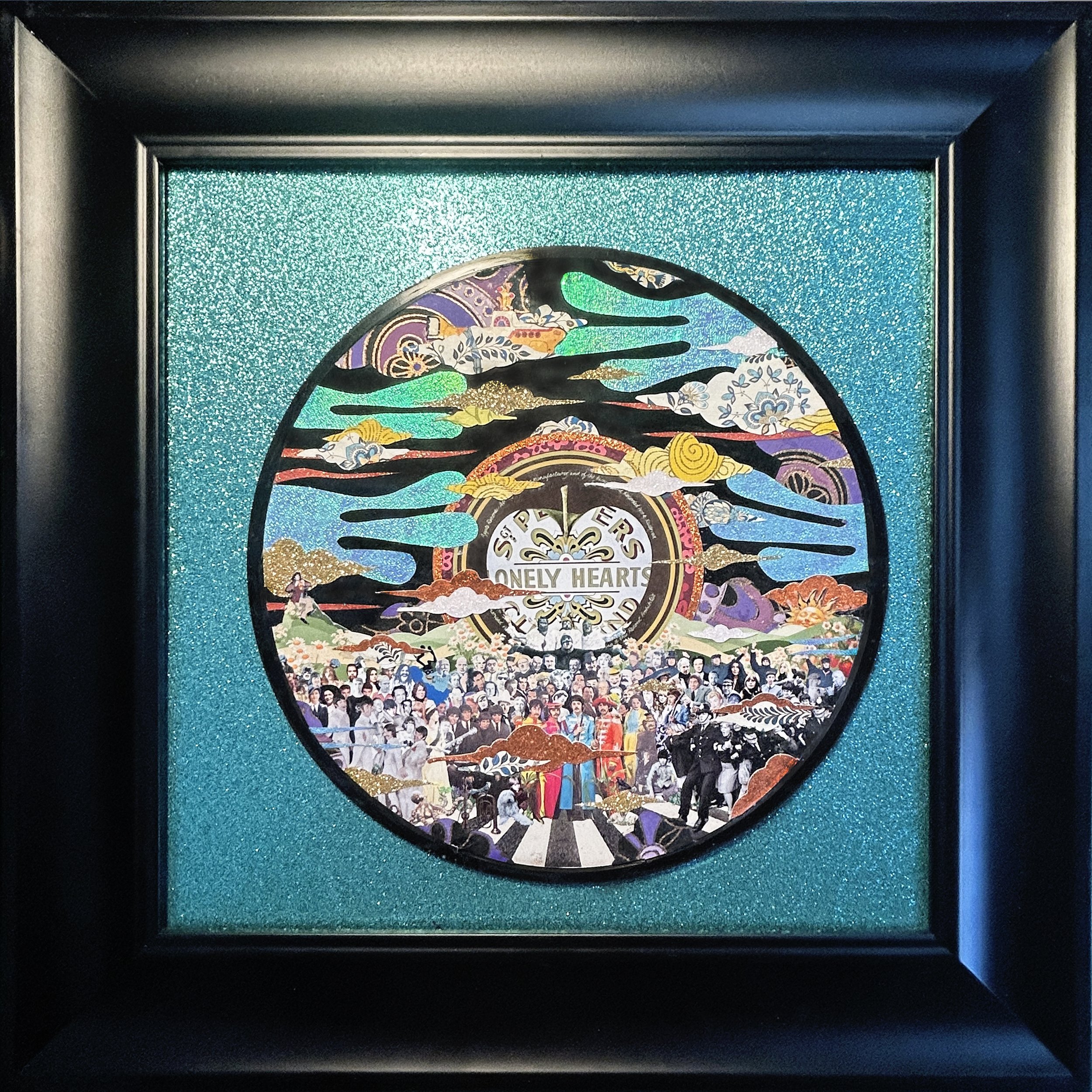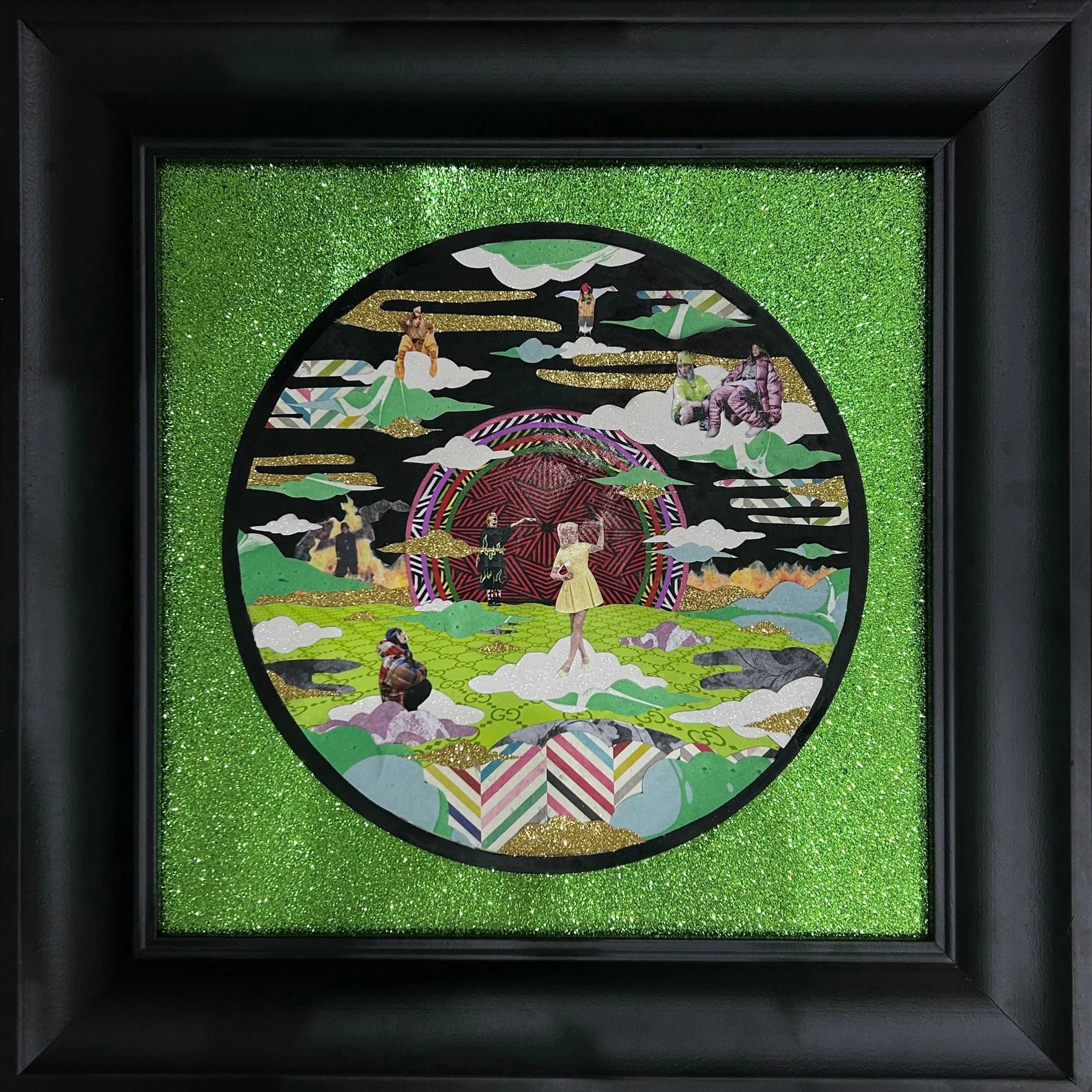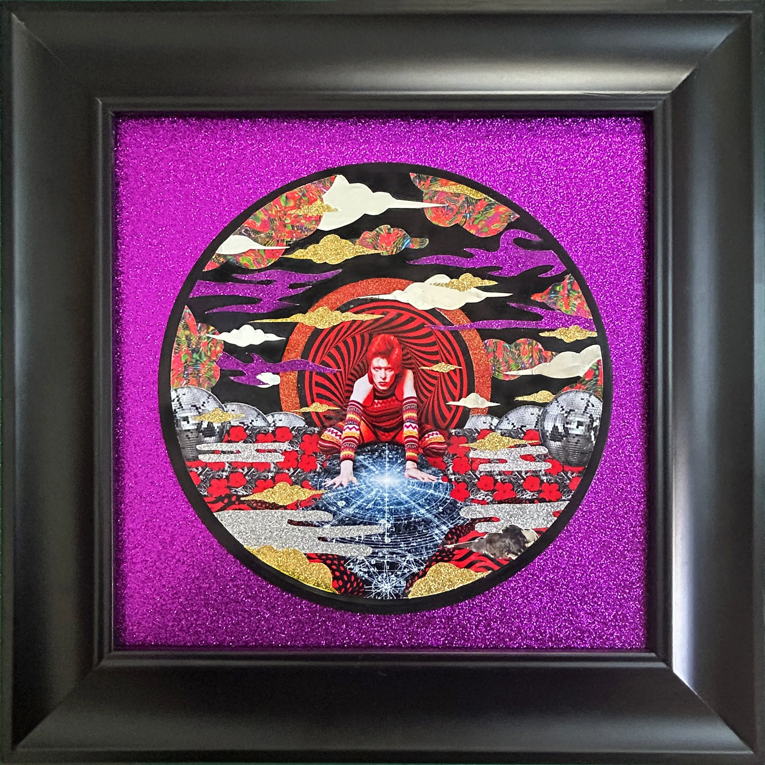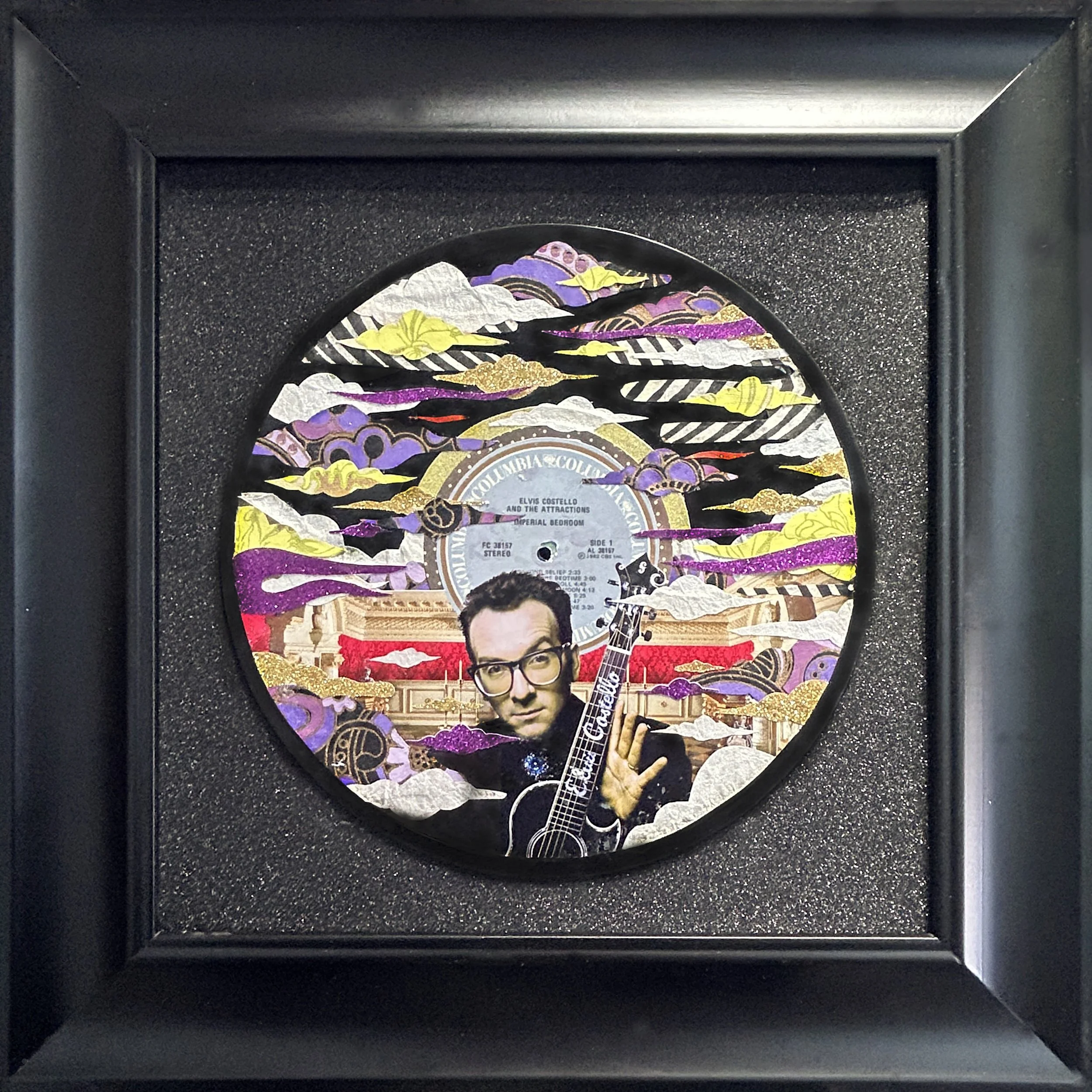 Set upon authentic vintage vinyl records, this mixed-media collage seamlessly integrates digital and analog processes, layering iconic rock imagery with finely curated decorative papers