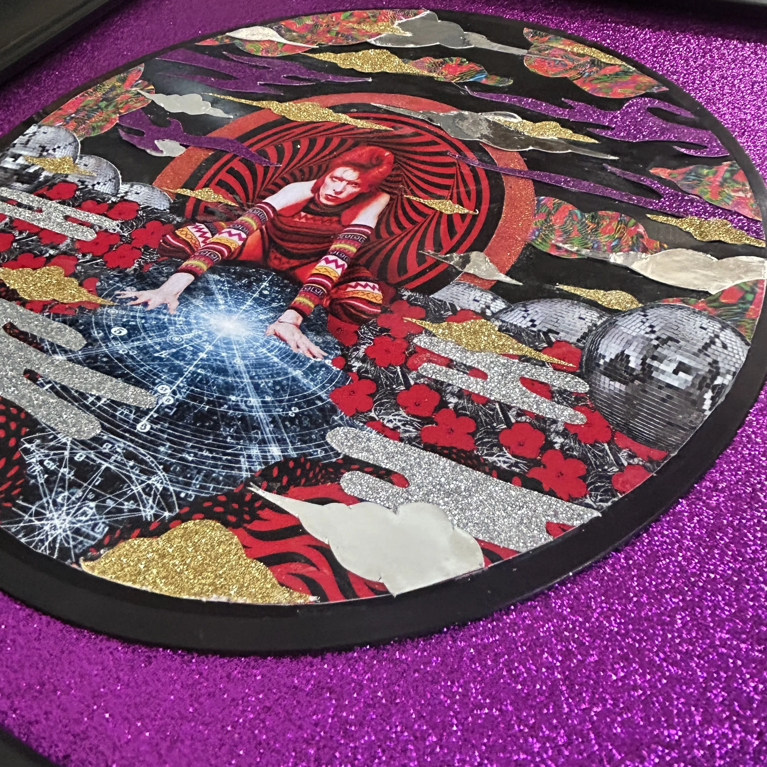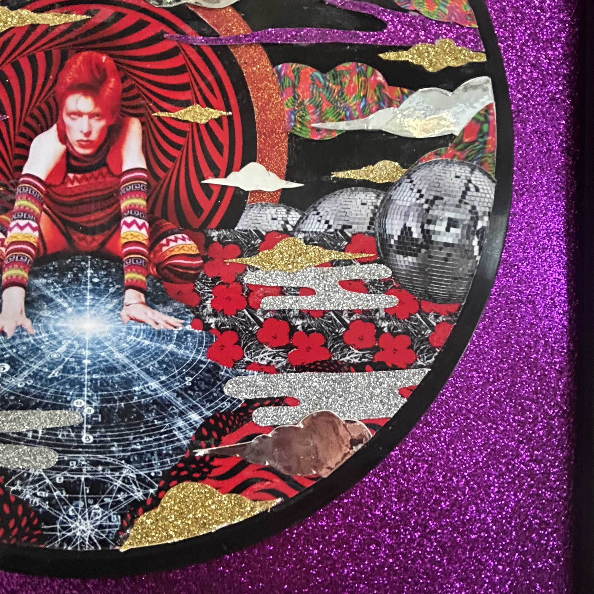 Andy Warhol’s flower motif opens to reveal the universe — radiant, and artificial—echoing Bowie’s fascination with surface, fame, and constructed identity. Seated above it, he feels otherworldly and unreadable, as if suspended between personas, quietly observing from somewhere just beyond reach.