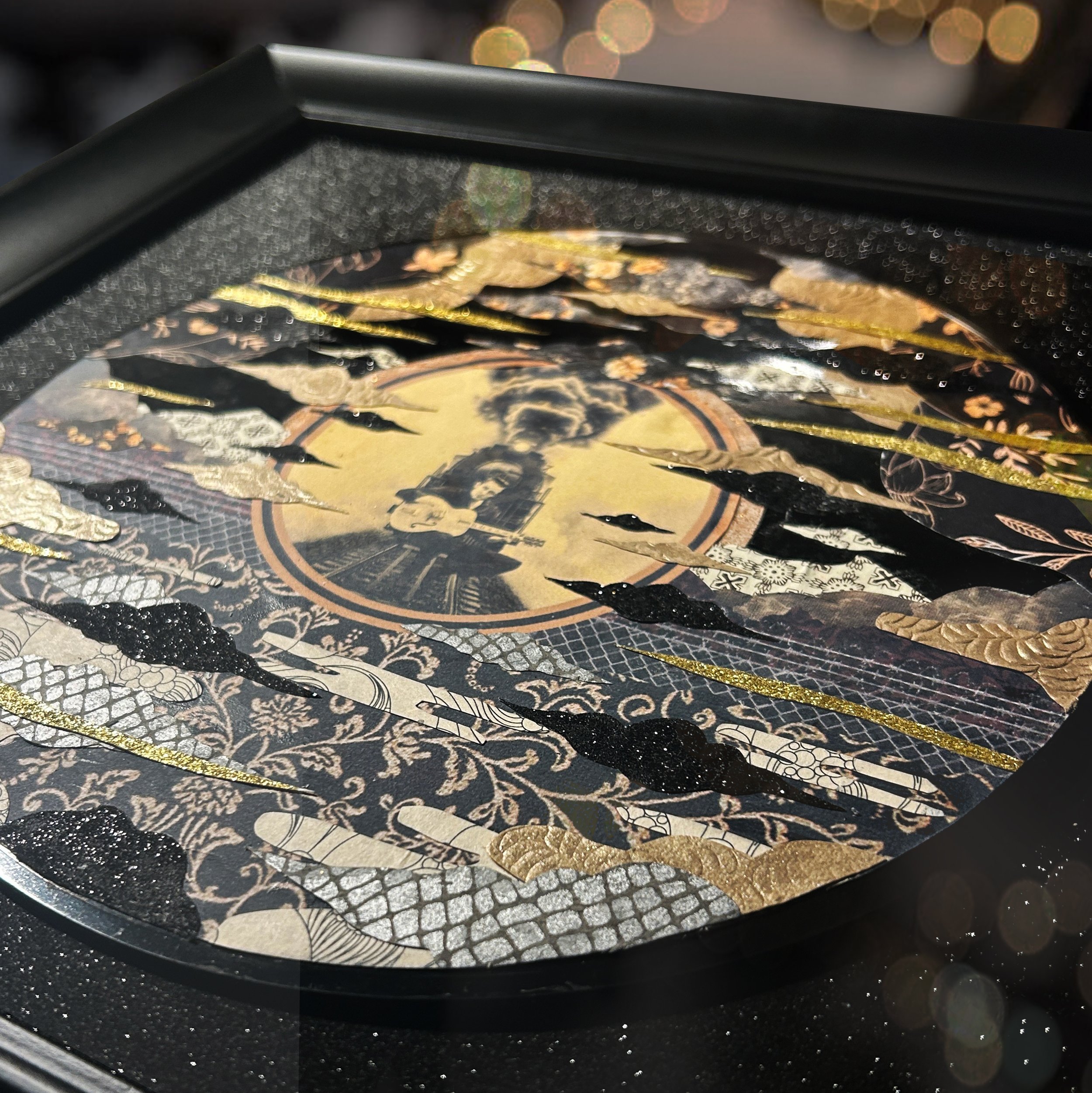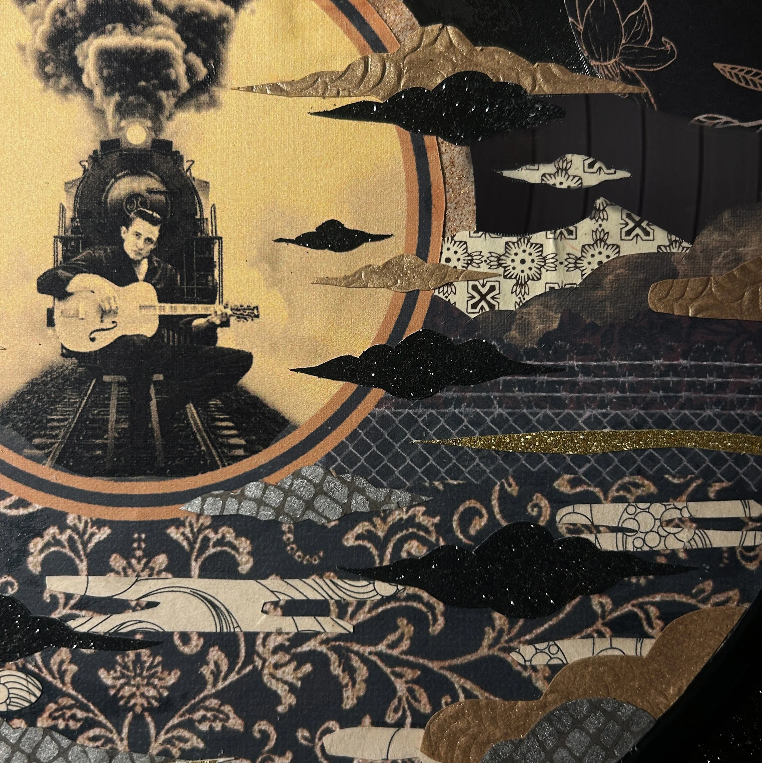 Johnny Cash sits on the train tracks with his guitar as a locomotive barrels down, full steam, heading for Folsom Prison. A barbed wire fence runs across the horizon (it’s chain link pattern is echoed in clouds cut from snakeskin paper).