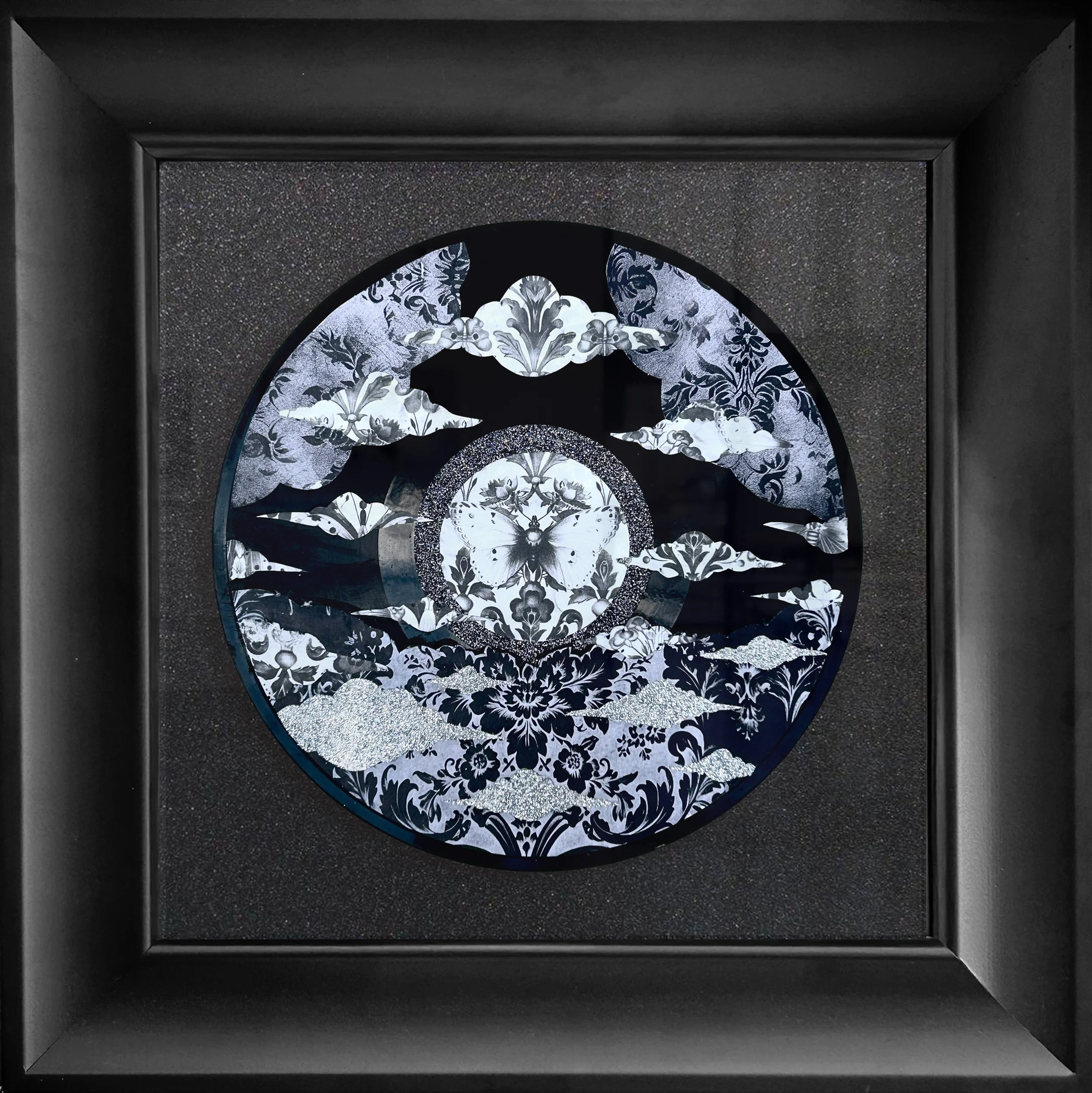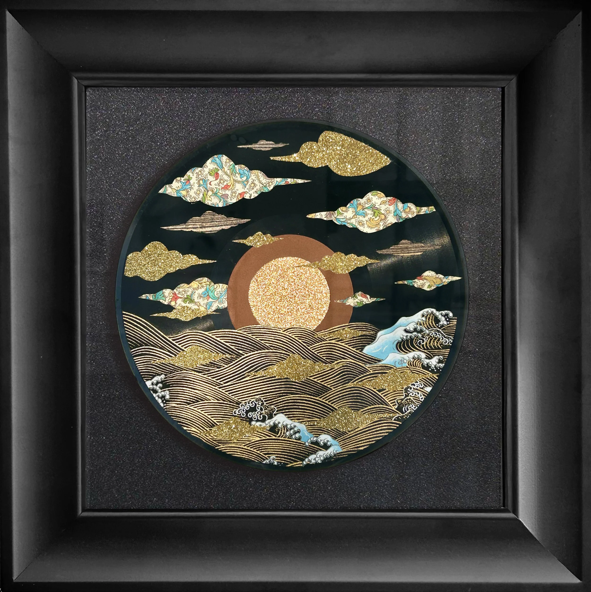 Ethereal landscapes set on vintage records, perfect for music lovers, mounted on black glitter paper and elegantly framed.