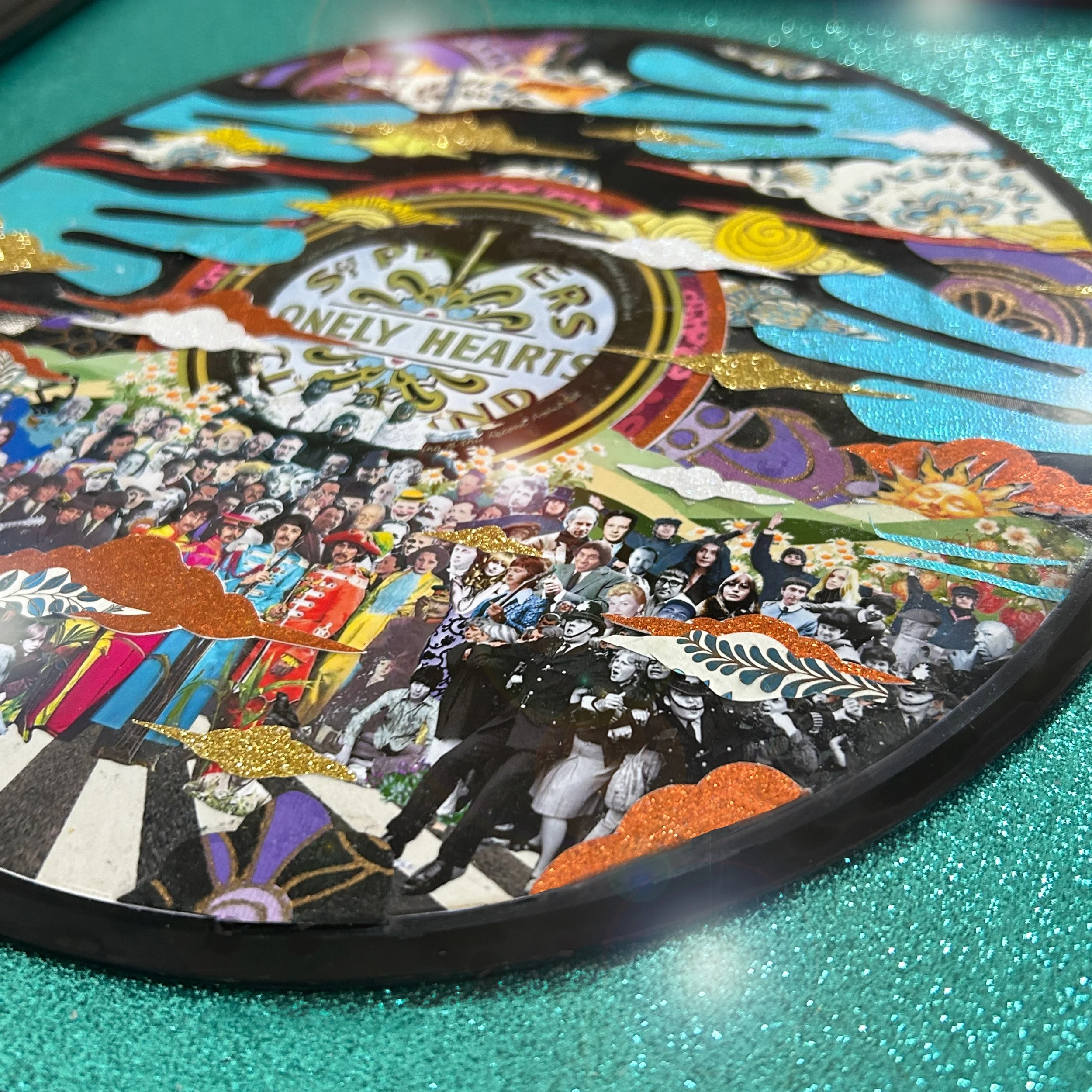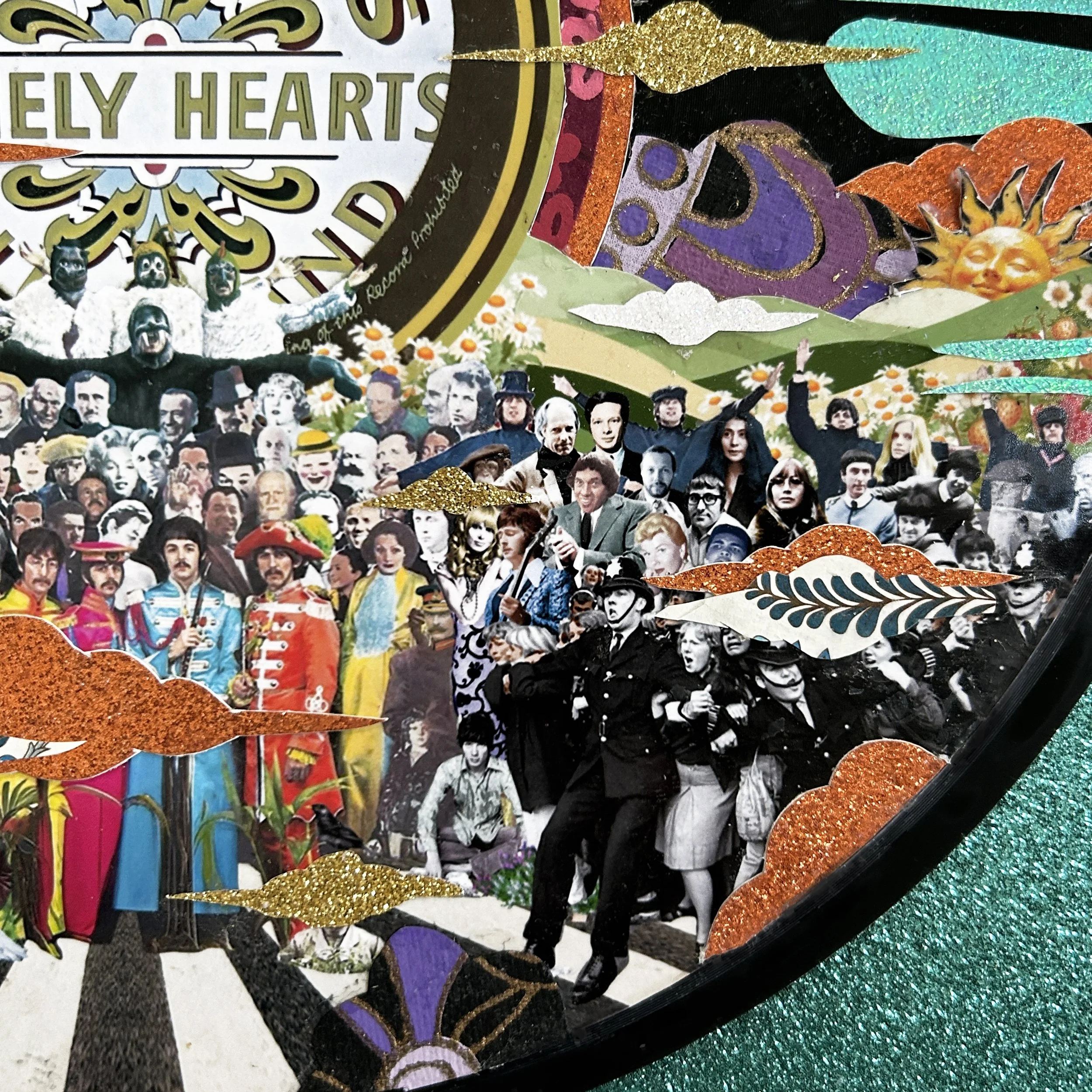 This piece captures The Beatles as an ever-expanding universe—centered on their iconic Sgt. Pepper’s Lonely Hearts Club Band collage, then pushed outward into a living ecosystem of influence, memory, and myth.