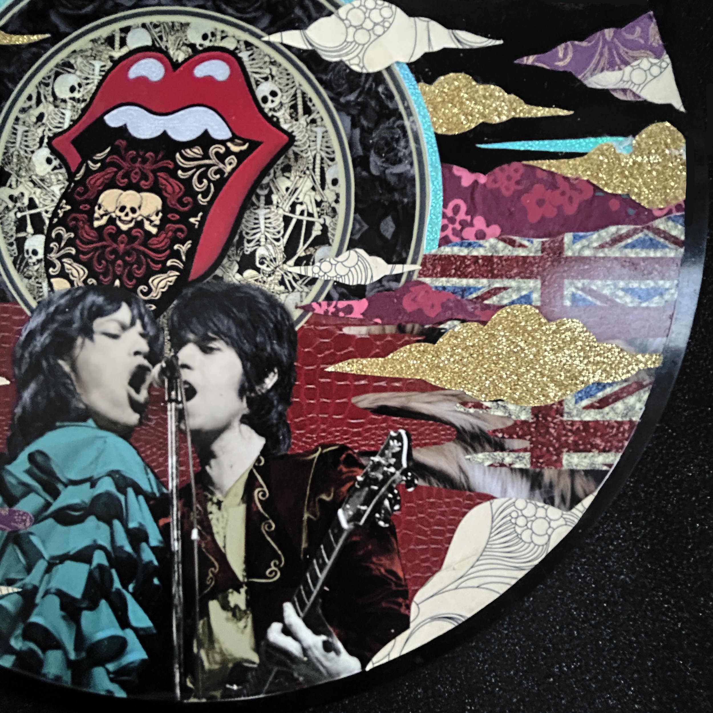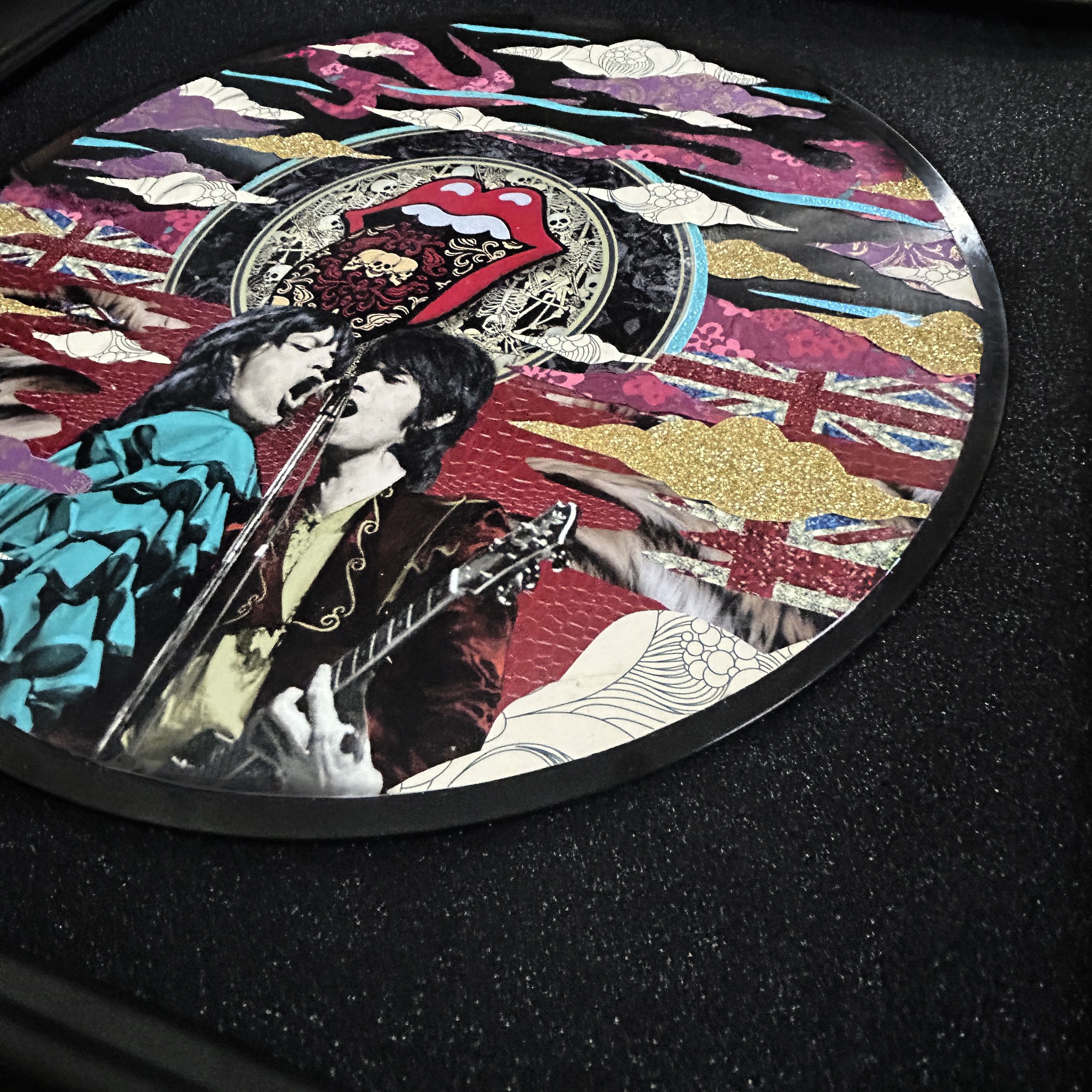Built on vintage vinyl, the composition layers textures of fur, a sequined Union Jack, and the unmistakable Rolling Stones tongue and lips logo—cut through with a digital collage skull that nods to the band’s long flirtation with danger, decadence, and mortality.